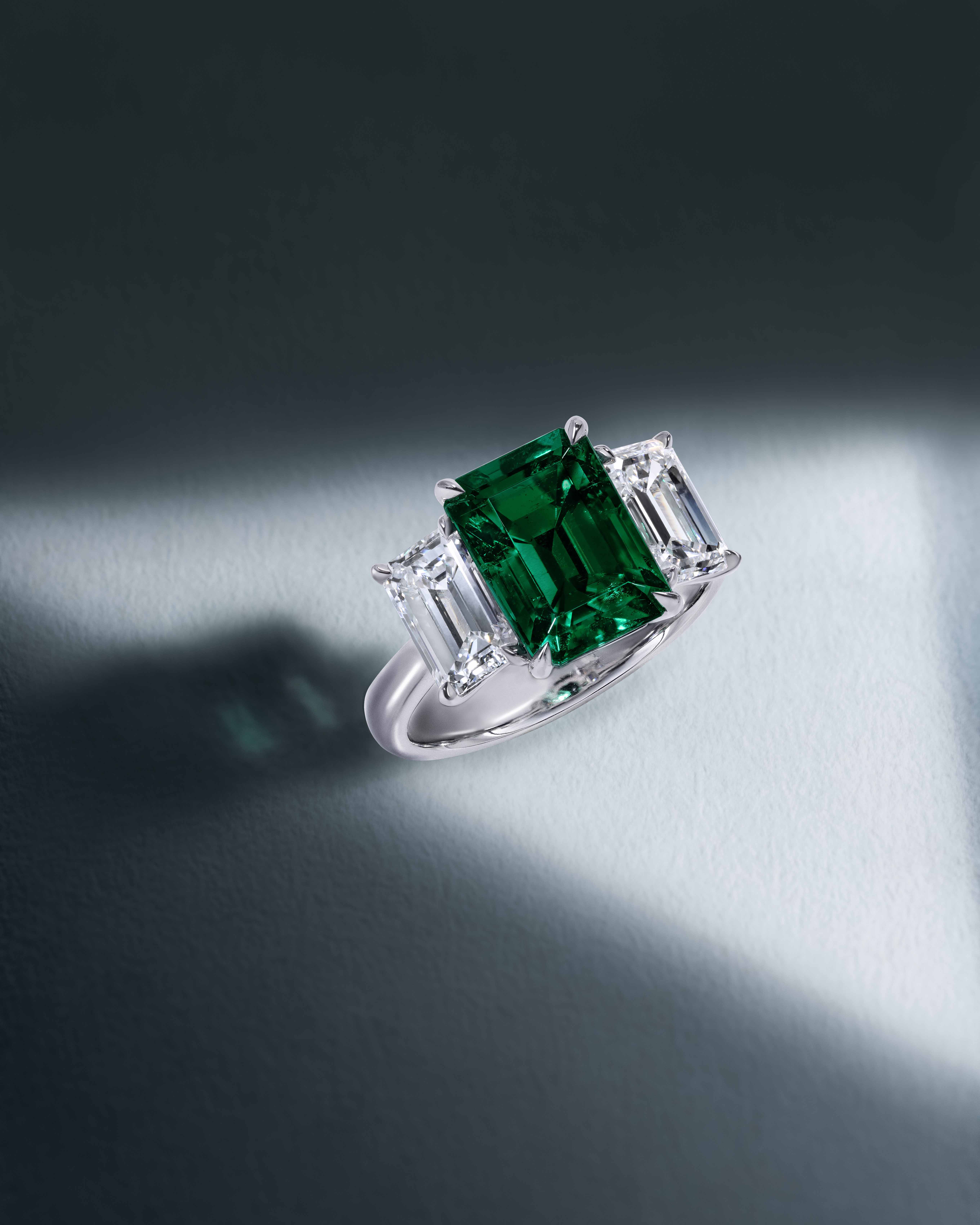 A 3.20+ct Colombian emerald without clarity enhancement, sets the stage for this striking 3-stone emerald-cut ring.