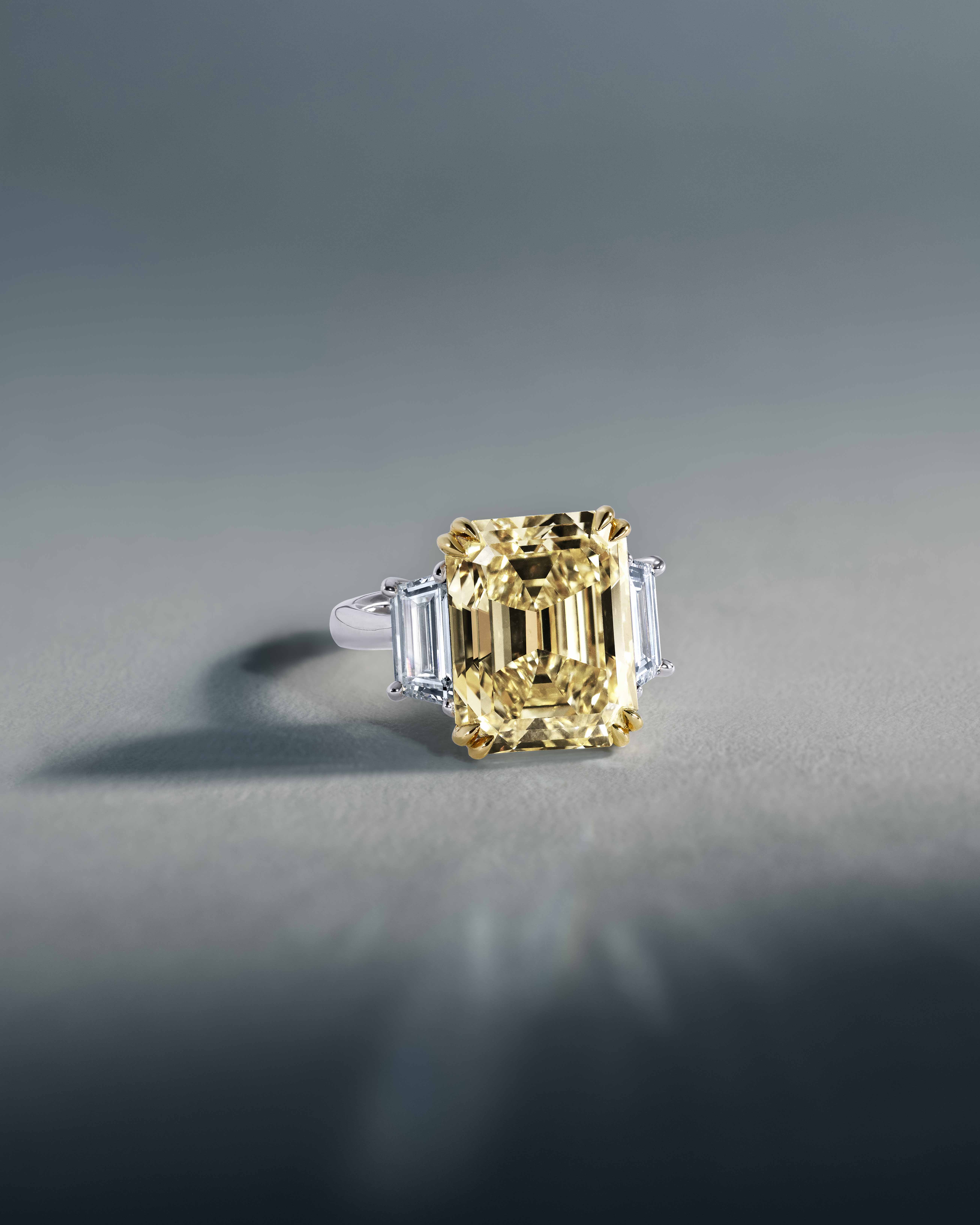 A ‘hall of mirrors’. Enthralling Emerald-cut Fancy Yellow Diamond over 10 carats.