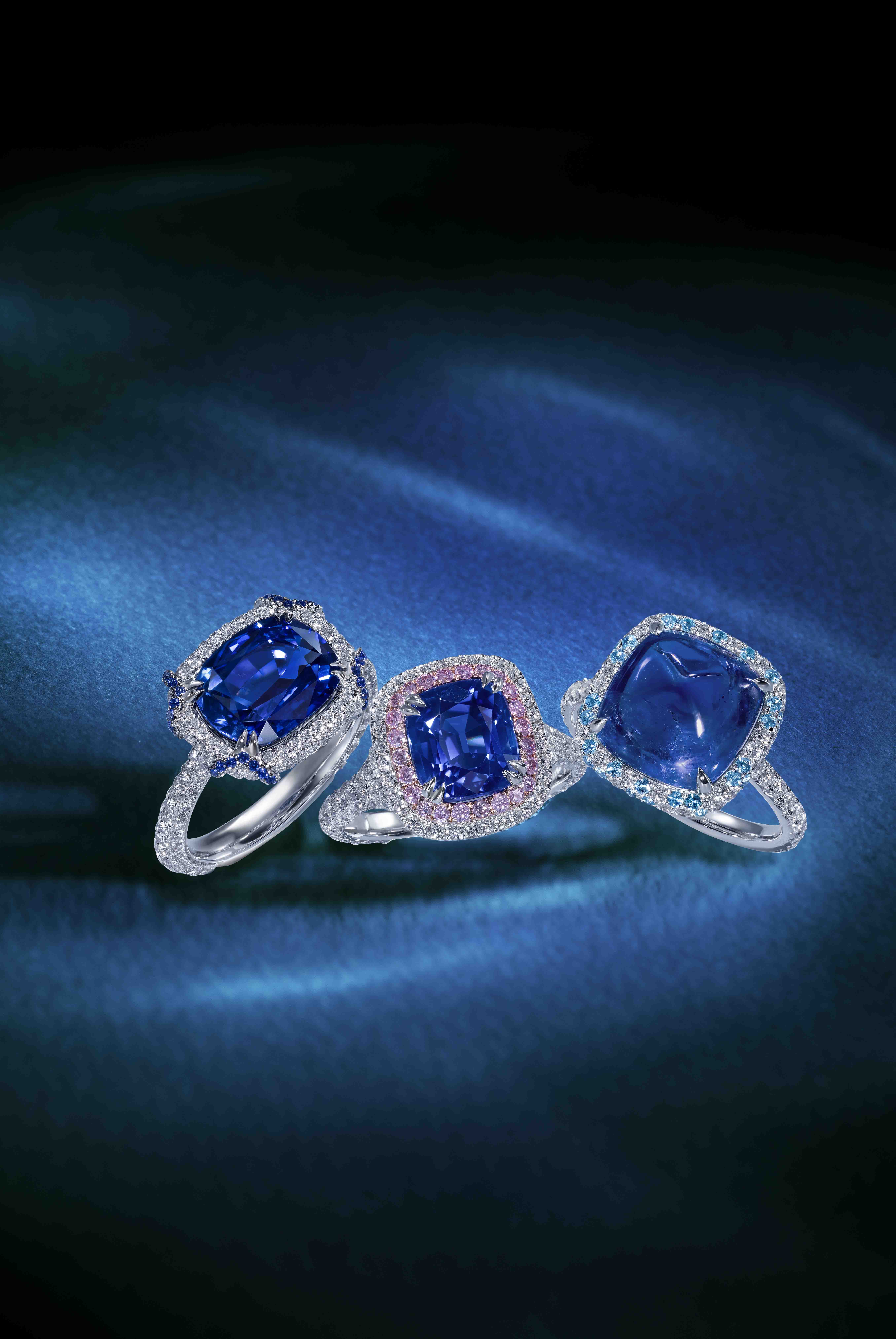 A precious trio of unheated blues – These cushion-cut sapphire rings present a display of rich, vibrant tones with a colored halos. ⁠ ⁠