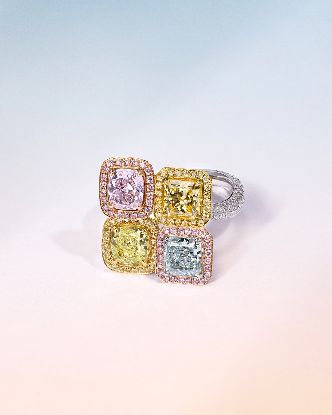 The essence of time captured⁠ in Dehres’ “Four Seasons” ring with complementary Fancy Colored diamonds.