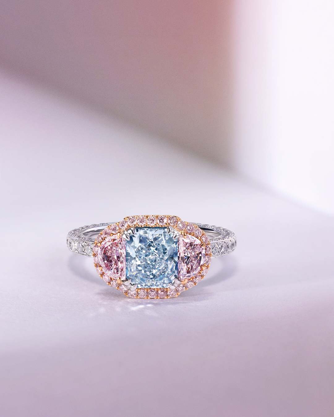 A love for pastel colors. Fancy Light Blue diamonds adorned with soft pink diamonds.  ⁠