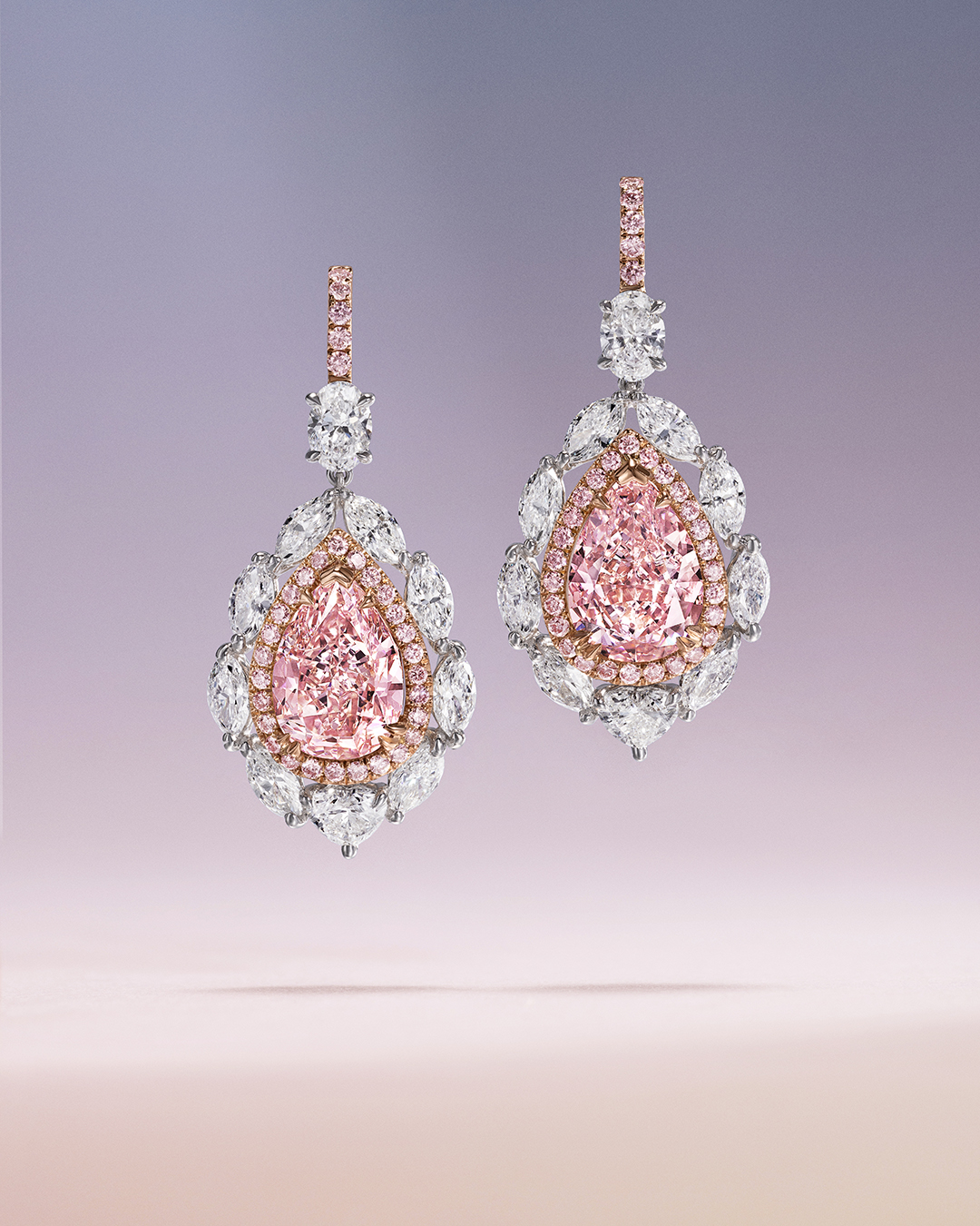 In all its glory. Pear-shaped Fancy Intense pink diamonds over 3 carats each.