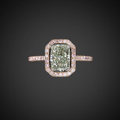 This radiant ring’s fancy green diamond centerpiece is made even more spectacular by its contrasting frame of fancy pink diamonds that accentuates the intensity of the green color.⁠ ⁠ Treasure it: Featuring a cushion cut saturated fancy intense green diamond of 2.40 carats carats encircled by a halo of purplish pink diamonds.⁠ ⁠