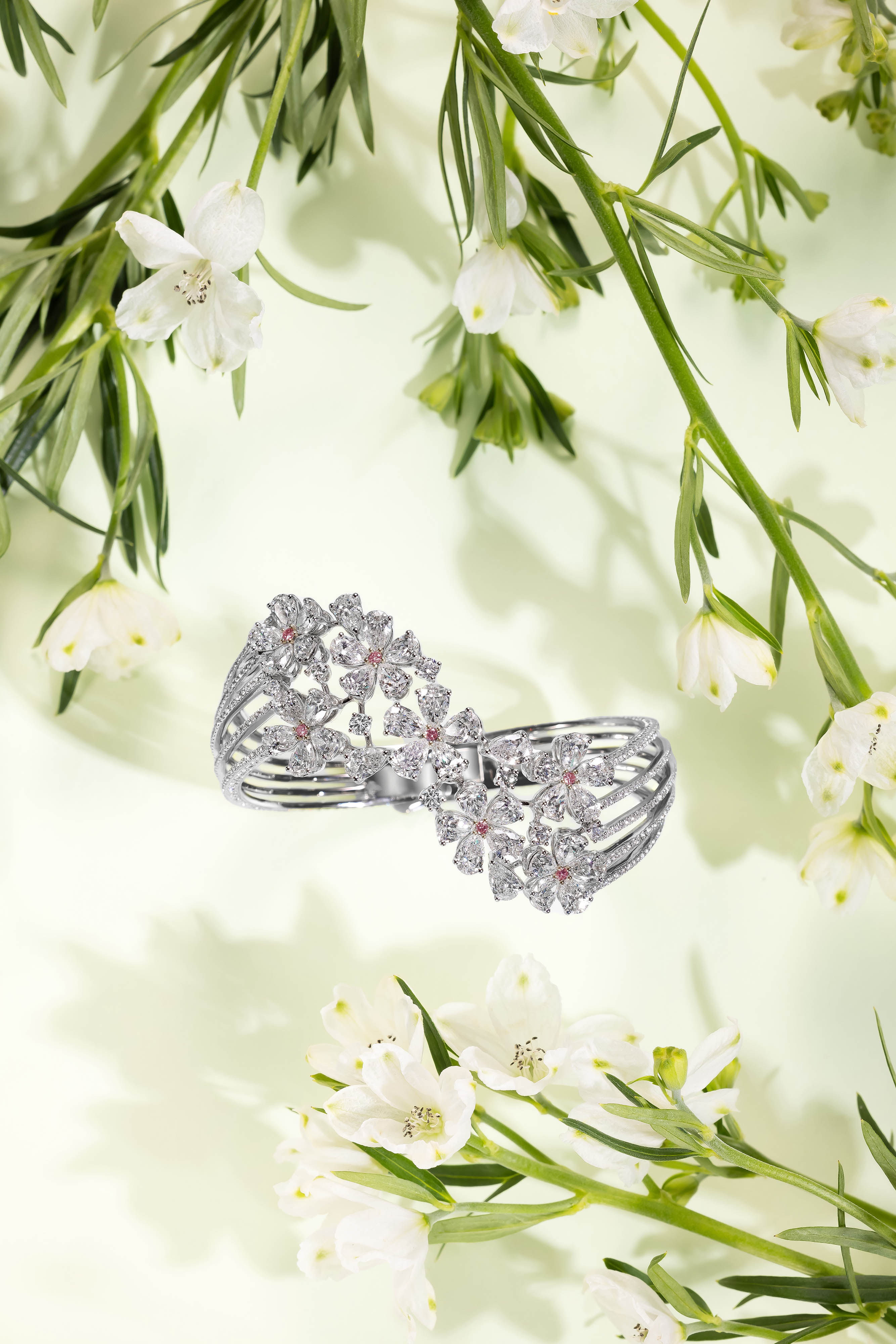 This exquisitely detailed bangle flourishes upon the wrist like first blooms of wildflowers. The smooth and seamless design makes the bangle as comfortable to wear as it is beautiful to admire. Treasure it: A bold and brilliant bangle of diamond florets artistically arranged to highlight 7 fancy pink diamonds. ⁠