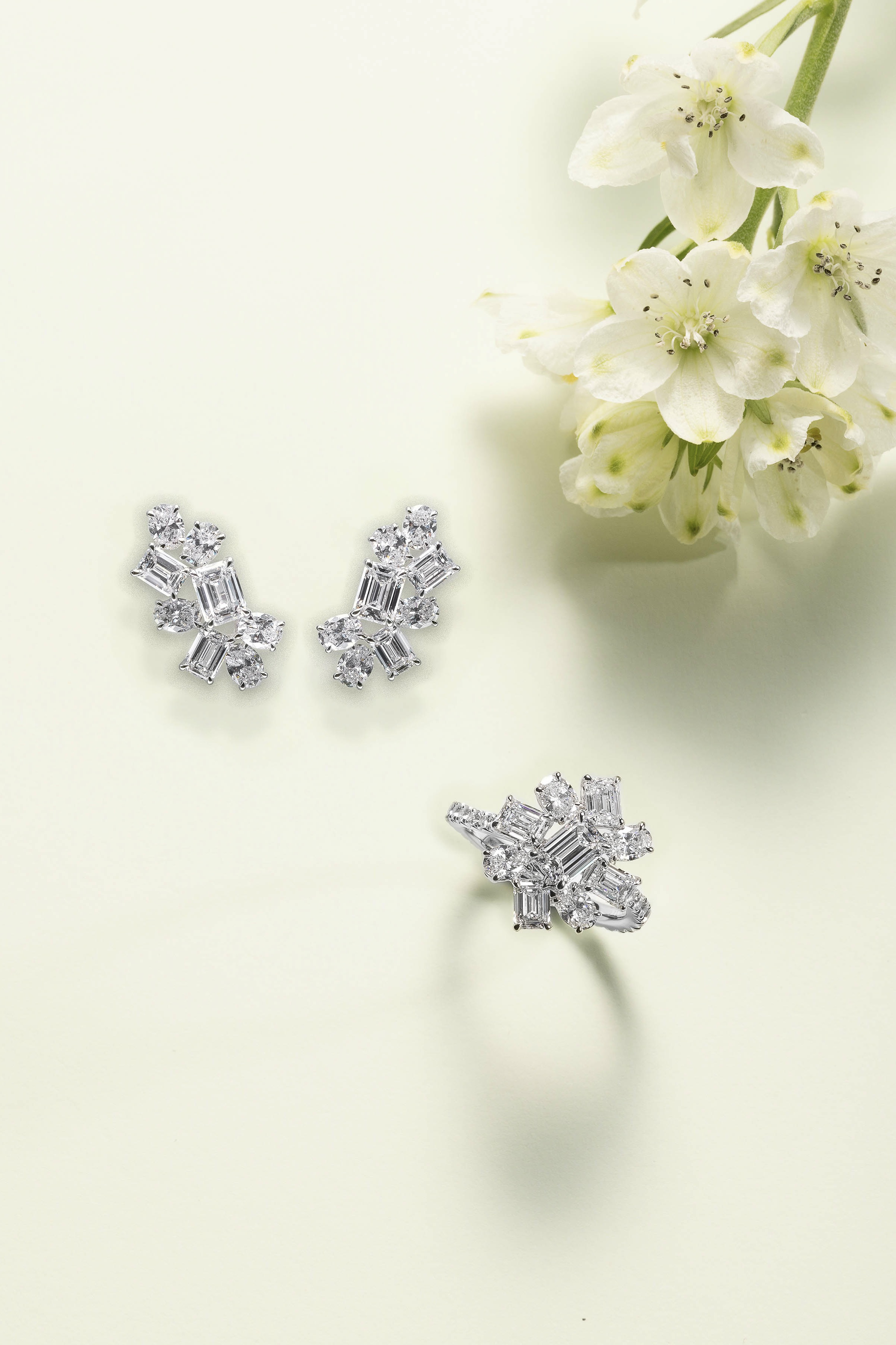 This striking and sophisticated earring and ring set combines the classic elegance of emerald diamonds with modern and chic mixed-cuts. The abstract floral silhouettes capture the perfect marriage of modern and feminine.