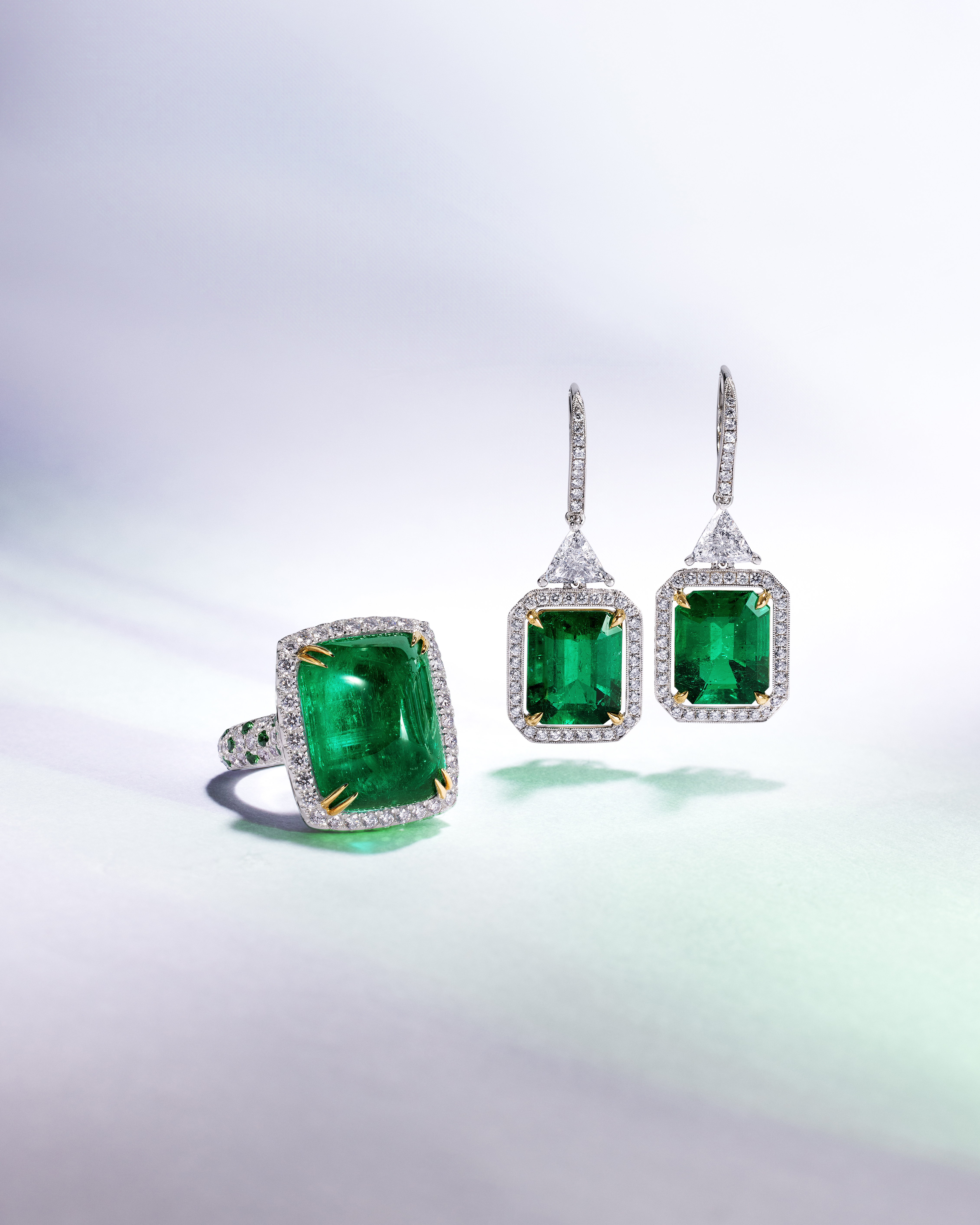 A homage to “Muzo green” emeralds. From the renowned Muzo mines, emeralds of this variety display a saturated, lush green.The cabochon/sugarloaf-cut ring, with the distinctive dome-shaped top is without any facets, highlighting the emerald’s natural vivid green. Perfectly complemented by “Muzo” earrings.
