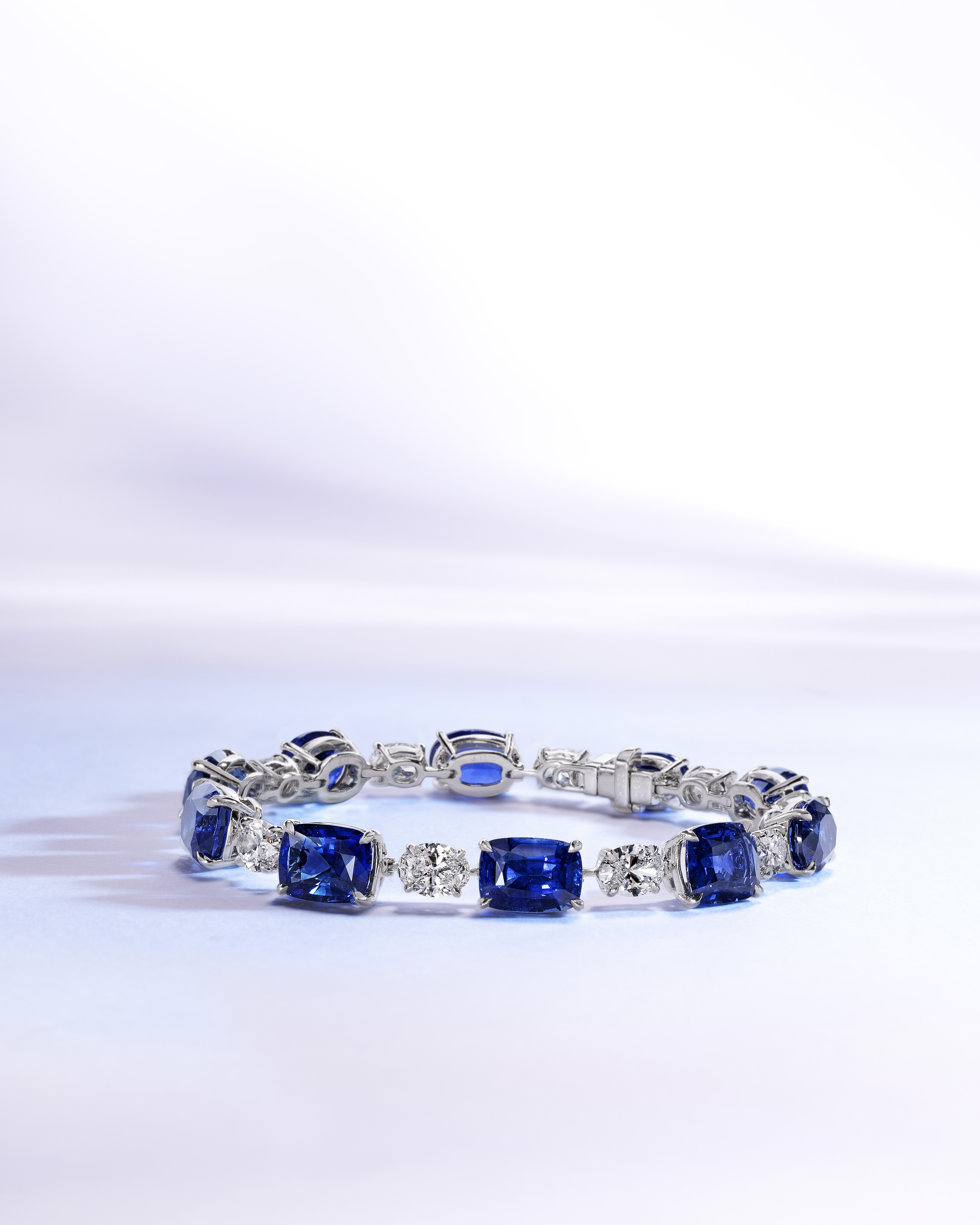 Fusion of form and color. Cushion and oval cuts form a geometric display on the wrist, centered on “Royal Blue” Sri-Lankan sapphires prized for their clarity and color.